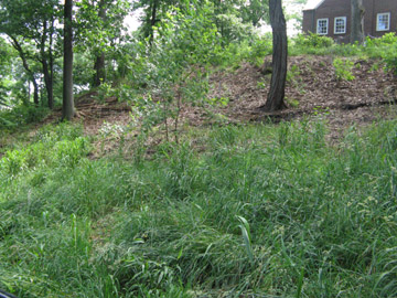 June 11, 2012 Strength, persistence, a good sense of balance, the ability to recognize Garlic Mustard and Celandine, and a desire to clear the golf course clubhouse hillside of invasive weeds, were essential qualities for these volunteers. They completed the task, leaving the hillside bare in spots, but now able to support the native plant species that were planted here two years ago when landscaping was done on the hillside. |