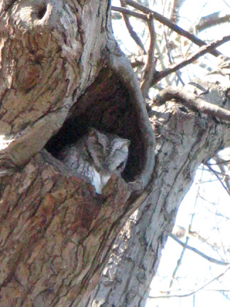 at a red phase Screech Owl in the familiar tree cavity over the Pond