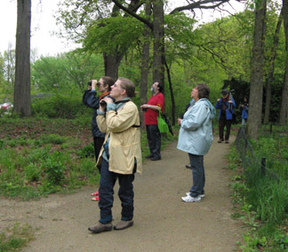 Bird walk leader Nancy Guppy (yellow jacket) searches the canopy for
