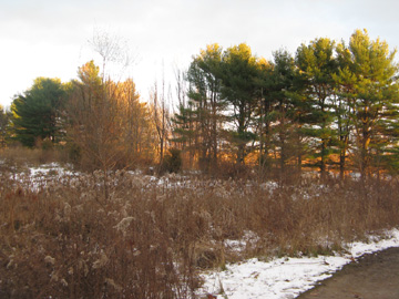 November 28, 2014 Lusitania Meadow Late afternoon sunshine illuminated the remaining gold-colored oak leaves, and the green needles of white pines surrounding the meadow. This season's first snowfall left an about an inch on the ground.