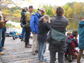 We saw a variety of waterfowl during this walk, including ring-necked ducks, ruddy ducks, mallards, double-crested cormorants, and hooded mergansers. Here, participants enjoyed Black’s Nook: on the left, observing hooded mergansers, and on the right, looking for frogs.